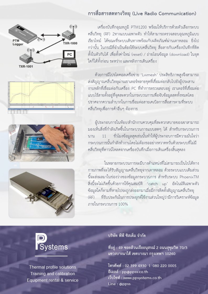เครื่องบันทึกอุณหภูมิ PTM1200 พร้อมให้บริการด้วยตัวเลือกระบบคลื่นวิทยุ (RF) 2ทางแบบเฉพาะตัว ทำให้สามารถตรวจสอบอุณหภูมิแบบเรียวไทม์ ได้ขณะที่ระบบเดินทางพร้อมกับผลิตภัณฑ์ผ่านเตาหลอม ยิ่งไปกว่านั้น ในกรณีที่จำเป็นต้องใช้ระบบคลื่นวิทยุ สื่อสารกับเครื่องบันทึกที่ติดตั้งในตัวกันได้ เพื่อตั้งค่าใหม่ (reset) / ถ่ายโอนข้อมูล (download) ในจุดใดก็ได้ทั้งก่อน ระหว่าง และหลังการเดินเครื่อง ด้วยการมีโปรโตคอลเครือข่าย ‘Lwmesh’ ประสิทธิภาพสูงจึงสามารถส่งสัญญาณคลื่นวิทยุผ่านเราเตอร์หลายชุดที่เชื่อมต่อกลับไปยังผู้ประสานงานหลักที่เชื่อมต่อกับเครื่อง PC ที่ทำการตรวจสอบอยู่ เราเตอร์ที่เชื่อมต่อแบบไร้สายตั้งอยู่ที่จุดสะดวกในกระบวนการเพื่อจับข้อมูลสดทั้งหมดโดยปราศจากความลำบากในการเชื่อมต่อสายเคเบิลการสื่อสารตามที่ระบบคลื่นวิทยุเพื่อการค้าอื่นๆ ต้องการ ผู้ประกอบการในห้อง/สำนักงานควบคุมที่สะดวกสบายของเขาสามารถมองเห็นสิ่งที่กำลังเกิดขึ้นในกระบวนการแบบสดๆ ได้ สำหรับกระบวนการนาน 11 ชั่วโมงข้อมูลสุดเช่นนั้นทำให้ผู้ประกอบการมีความมั่นใจว่ากระบวนการนั้นกำลังทำงานโดยไม่ต้องรออย่างหวาดหวั่นด้วยระบบที่ไม่มีคลื่นวิทยุที่ดาวน์โหลดจากเครื่องบันทึกเมื่อการเดินเครื่องสิ้นสุดลง ในหลายกระบวนการจะมีบางตำแหน่งที่ไม่สามารถเป็นไปได้ทางกายภาพที่จะได้รับสัญญาณคลื่นวิทยุจากเตาหลอม ด้วยระบบแบบเดิมส่วนนี้จะส่งผลมาในช่องว่างของข้อมูลกระบวนการ สำหรับระบบ PhoenixTM สิ่งนี้จะไม่เกิดขึ้นด้วยการใช้คุณสมบัติ ‘catch up’ อัตโนมัติเฉพาะตัว ข้อมูลใดก็ตามที่หายไปจะถูกส่งออกมาเมื่อมีการติดตั้งสัญญาณคลื่นวิทยุ (RF) ที่รับประกันในการประยุกต์ใช้งานส่วนใหญ่ว่ามีการวิเคราะห์ข้อมูลภายในกระบวนการ 100%
